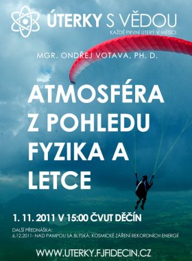Přednáška o fyzice, chemii a poletování v ovzduší Přednáška bude věnována atmosféře - prostředí, které nás bezprostředně obklopuje a které má zcela zásadní význam pro náš život. Pro mne je pak atmosféra na jedné straně předmětem vědeckého bádání a na straně druhé hřištěm, na kterém se věnuji jednomu z mých oblíbených sportů - létání na padákových kluzácích. Pokusím se vám přiblížit obě tyto stránky mého zájmu o atmosféru a ukázat, jak jedna souvisí s druhou.