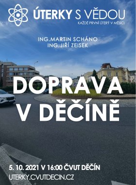 Doprava je v Děčíně a jeho okolí zvláště v poslední době velice probírané téma. Zástupci děčínského pracoviště Fakulty dopravní ČVUT vám v této přednášce osvětlí řadu aktuálních témat. Co nám říkají dopravní simulace o chování děčínských řidičů? Co můžeme čekat od plánované úpravy Labského nábřeží? Na co jsme přišli při dvanácti dopravních průzkumech v okolí Děčína za posledního půl roku? A samozřejmě vaše dotazy. Máte-li zájem položit dopravním expertům libovolný dotaz, neváhejte a v úterý se k nám přidejte.