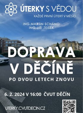 V dalším pokračování akce "Úterky s vědou" se zaměříme na plánované změny v oblasti děčínské dopravy. Zástupci místního pracoviště Fakulty dopravní se budou věnovat tématům Labského nábřeží, okolí hlavního nádraží v Děčíně, ulice Podmokelská. Představíme vám také projekt místních studentů ČVUT FD a Gymnázia Komenského řešící dlouho opomíjenou situaci na Komenského náměstí. Rádi bychom, abyste si z akce odnesli aktuální informace o dopravních projektech ve městě a předali našim dopravním odborníkům váš názor na ně. Diskuze s místními obyvateli je kriticky důležitá při projektech o velikosti hlavního nádraží či významného náměstí. Přijďte a podílejte se s námi na zlepšení našeho města.