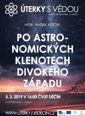 Cestopisně laděné vyprávění o vybraných astronomických tématech, inspirované výpravou děčínského rodáka za zatměním Slunce ve Spojených státech. Kde můžete navštívit zachovalý meteorický kráter, který jako by z oka vypadl těm marťanským? Co si myslí ve Flagstaffu o vyloučení Pluta ze seznamu planet? A může Měsíc Zemi uletět?