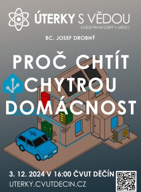 Chytrá domácnost, IoT. Zbytečná hračka nebo nezbytný pomocník? Drahá legrace, nebo úspora peněz? Od barevných žárovek, přes hlasového ovládání až po pokročilé řízení energií v domě. Spoustu možností, velký potenciál, ale také mnoho nástrah. Jak ovládat velké množství zařízení různých výrobců z jednoho místa? Jaké technologie a proč použít? Co všechno bychom měli vědět, aby se z dobrého pomocníka nestal zlý pán? Na tyto otázky odpoví poslední letošní přednáška Úterků s vědou, nazvaná „Proč chtít chytrou domácnost“. Povíme si jaká zařízení můžeme využít, co nám všechno mohou nabídnout, jak je nastavit. Autor přednášky působí přes 25 let na ČVUT v Děčíně jako správce budovy a v posledních letech prvky IoT aktivně používá. O zkušenosti, které za tu dobu získal, se s vámi rád na přednášce podělí.