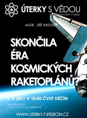 Třicet let byly americké raketoplány symbolem pokroku pilotovaných kosmických letů. První z nich byl na oběžnou dráhu vyslán 12. dubna 1981 -- přesně dvacet let po prvním kosmickém letu člověka. V letošním roce byly dva poslední letuschopné americké raketoplány s ohledem na vysoké provozní náklady dány definitivně do výslužby. Jejich operační nasazení provázela sláva i tragédie. Konstrukční řešení raketoplánů bylo kompromisem mezi ambiciózními záměry projektantů a finančními možnostmi kosmické agentury. Jaká hodnocení provázejí raketoplány Space Shuttle? O historii i budoucnosti tohoto typu kosmických prostředků bude hovořit Mgr. Jiří Kroulík, odborný pracovník Planetária Praha.