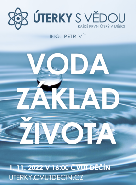 Voda jako živel, kde se voda vzala, dozvíme se o anomáliích vody, jejích zásobách, o oceánech, o vědě a výzkumu kolem vody, vlivu na klima, kdo se u nás o vodu stará a také o vodě neznámé. Ale to už bude na vlastní přednášce …