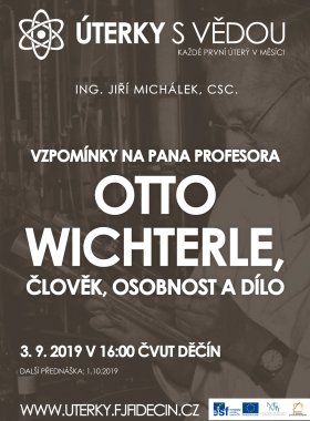 Je autorem jednoho z nejvýznamnějších vynálezů českého původu, kterým jsou měkké kontaktní čočky. Vedle měkkých kontaktních čoček proslul i svými pracemi v oblasti polyamidů. Silon byl výsledkem jeho působení ve výzkumném oddělení Baťových závodů ve Zlíně, kam nastoupil po uzavření českých vysokých škol v roce 1939. V poválečných letech se vrátil na ČVUT a po zákazu pedagogické činnosti v padesátých letech založil Ústav makromolekulární chemie ČSAV. Se svými kolegy se zabýval výzkumem hydrogelů. Právě z nich byly odlity první měkké kontaktní čočky a profesor Wichterle neúnavně pokračoval ve zlepšování jejich vlastností i ve vývoji dalších aplikací hydrogelů v lékařství. Přednáška připomene osobnost a dílo prof. Wichterleho nejen fakty, ale i osobními vzpomínkami autora.
